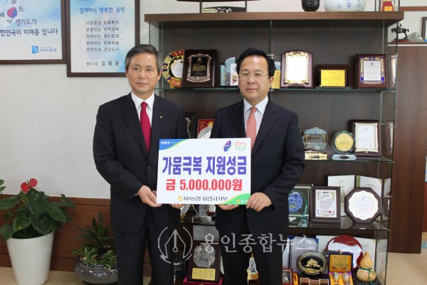 NH농협 용인시지부(지부장 서은호)는 6. 29(금) 용인시청(시장 김학규) 청사에서 이번 가뭄으로 많은 어려움을 겪고 있는 농업인들을 위해 사용해 달라며 농협 임직원이 모금한 성금을 가뭄피해농가의 양수기 구입 지원 자금으로 전달하였다.
