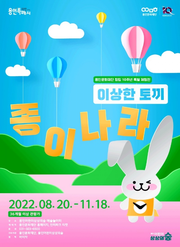 (재)용인문화재단(이사장 이상일)이 운영하는 ‘용인어린이상상의숲(이하 상상의숲)’ 공연놀이터와 예술놀이터에서는, 오는 20일부터 신규 어린이 공연 프로그램 <가루가루 얍!> 과 어린이 전시 프로그램 <종이나라 이상한 토끼>를 진행한다.