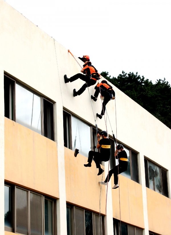 이어 드론 폭탄에 의한 화재 발생 상황을 가정해, 재난종합지원센터 119 상황실 신고와 직원 대피, 소방서 출동과 화재 진압, 현장 인명구조 등의 활동을 진행했다.