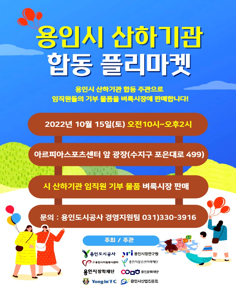 용인도시공사(사장 최찬용)는 오는 15일 오전 10시부터 오후 2시까지, 아르피아스포츠센터 앞 광장(용인시 수지구 포은대로 499)에서 '용인시 산하기관 합동 플리마켓'을 개최한다고 밝혔다.