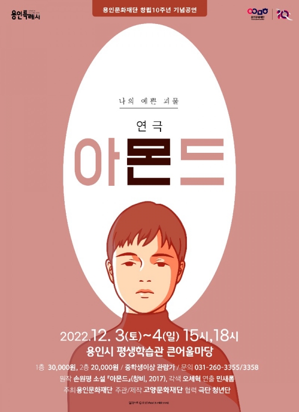 (재)용인문화재단(이사장 이상일)은 오는 12월 3일과 4일 각각 15시, 18시 용인시 평생학습관 큰어울마당에서 연극<아몬드>를 총 4회에 걸쳐 공연한다.