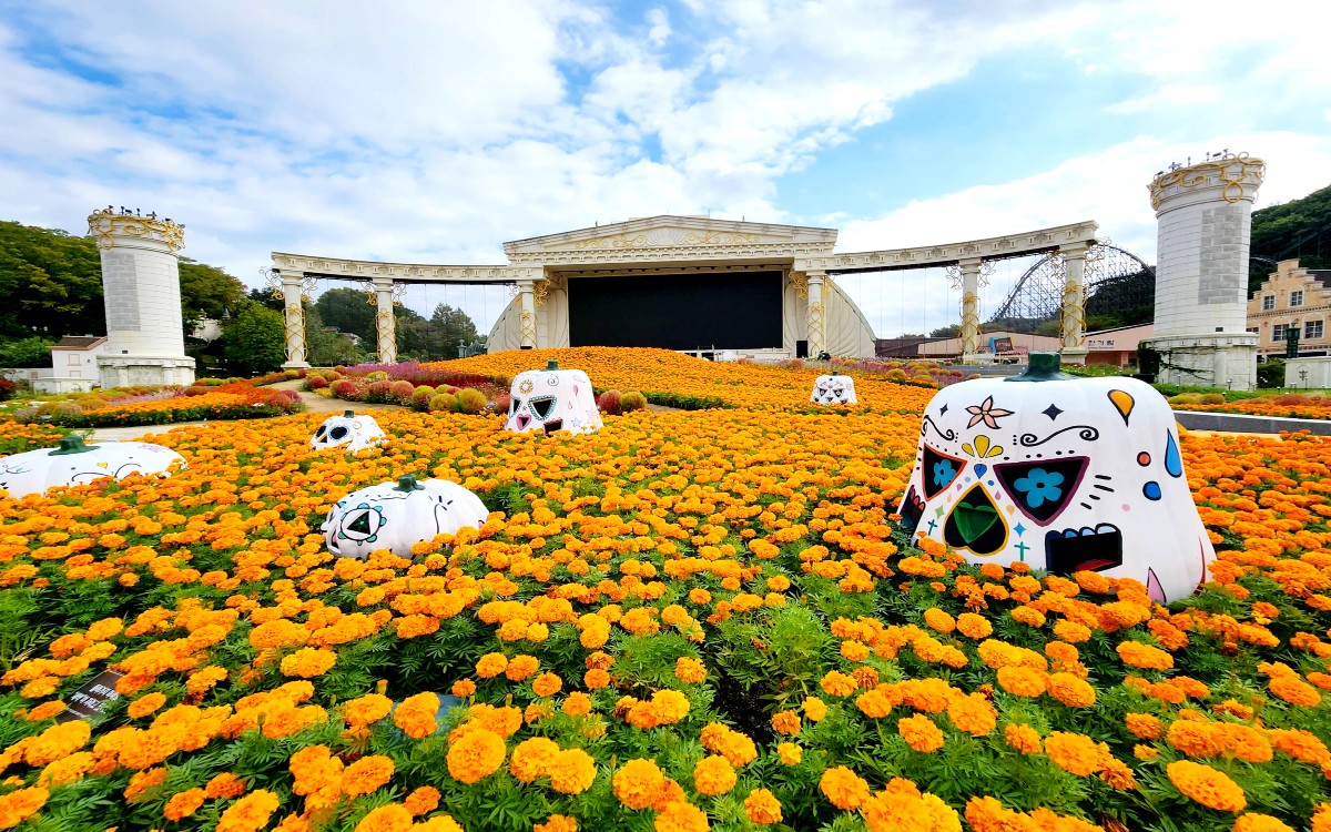 에버랜드 대표정원인 포시즌스가든을 방문하면 컬러풀한 호박 조형물들이 메리골드, 천일홍 등 가을꽃들과 함께 다채롭게 전시돼 있어 익살스러운 할로윈 추억 사진을 남길 수 있다.