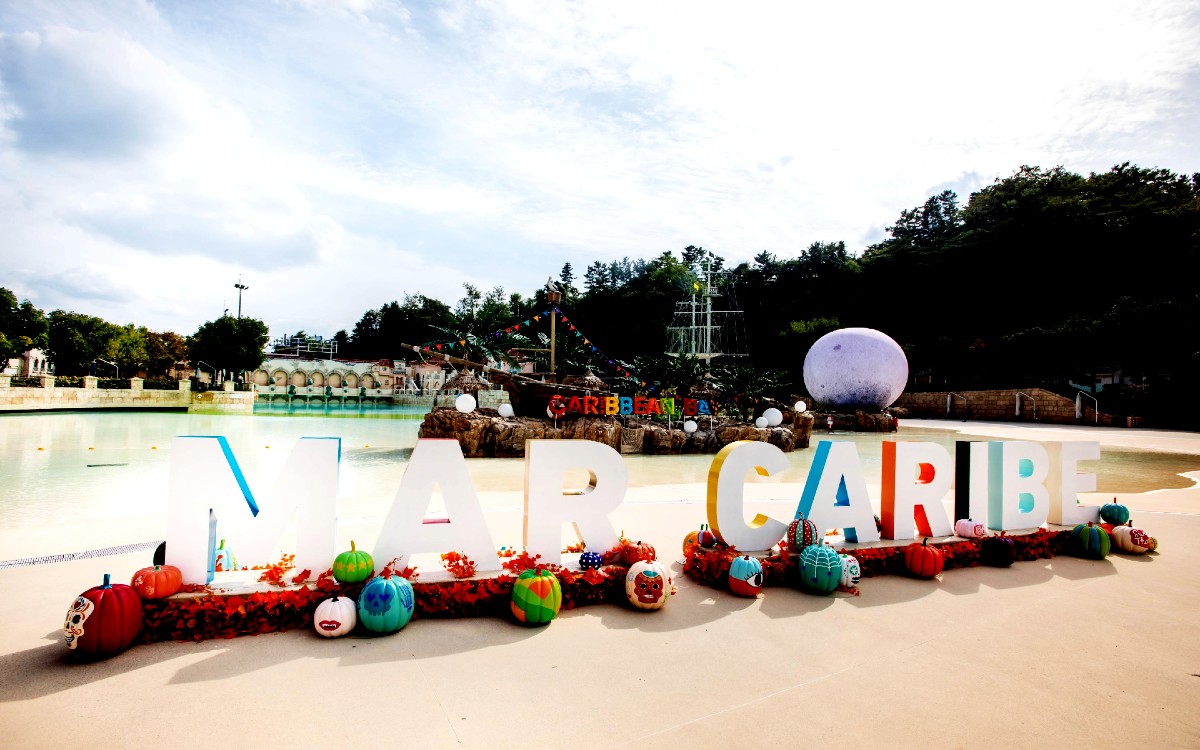 거대한 보름달 조형물, 야자수, 해먹, 비치 바 등 이국적인 해변 분위기의 야외 파도풀에는 컬러풀한 호박 데코, 가랜드, 메리골드 꽃 장식 등이 가득해 할로윈 분위기를 물씬 풍긴다.