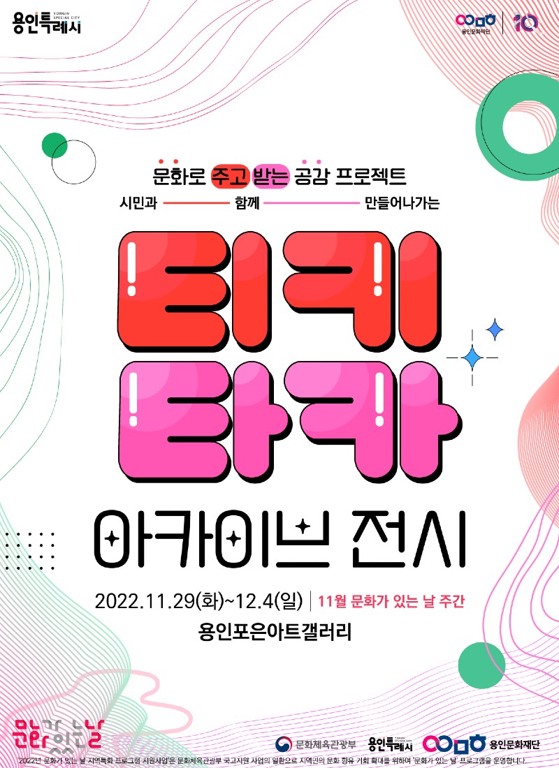 (재)용인문화재단(이사장 이상일)은 11월 문화가 있는 날 주간을 맞이하여, 오는 29일부터 12월 4일까지 용인포은아트갤러리에서 시민과 함께 만들어나가는 <티키타카 아카이브 전시>를 선보인다.