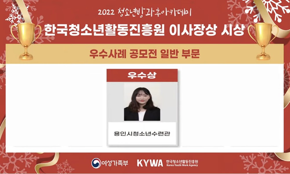 지난 7일 진행된 ‘2022년 청소년방과후아카데미 우수사례 공모전’에서 (재)용인시청소년미래재단(이사장 이상일) 용인시청소년수련관 청소년방과후아카데미가 일반분야 우수사례로 선정되어 한국청소년활동진흥원 이사장상(우수상)을 수상하였다.