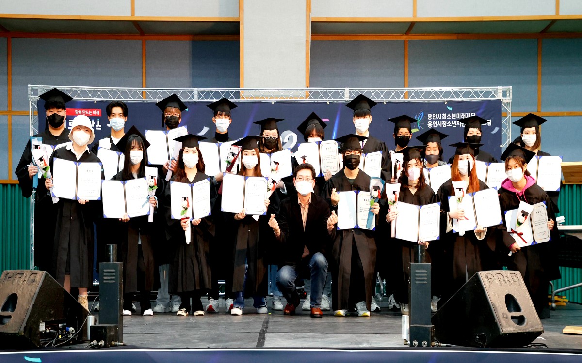 용인시청소년미래재단의 이사장을 맡고 있는 이상일 용인특례시장도 참석해 “여러분들은 하나의 성취를 일궜다. 이 자리에 함께한 여러분을 축하하고, 잘 지도해주신 선생님과 멘토, 뒷바라지해주신 부모님들께 감사 인사를 드린다”며 “졸업식을 영어로 코멘스먼트(Commencement)라고도 한다. 코멘스먼트는 시작이라는 뜻을 갖고있다. 오늘은 꿈을 향해 출발하는, 새롭게 시작하는 날”이라고 축하했다.