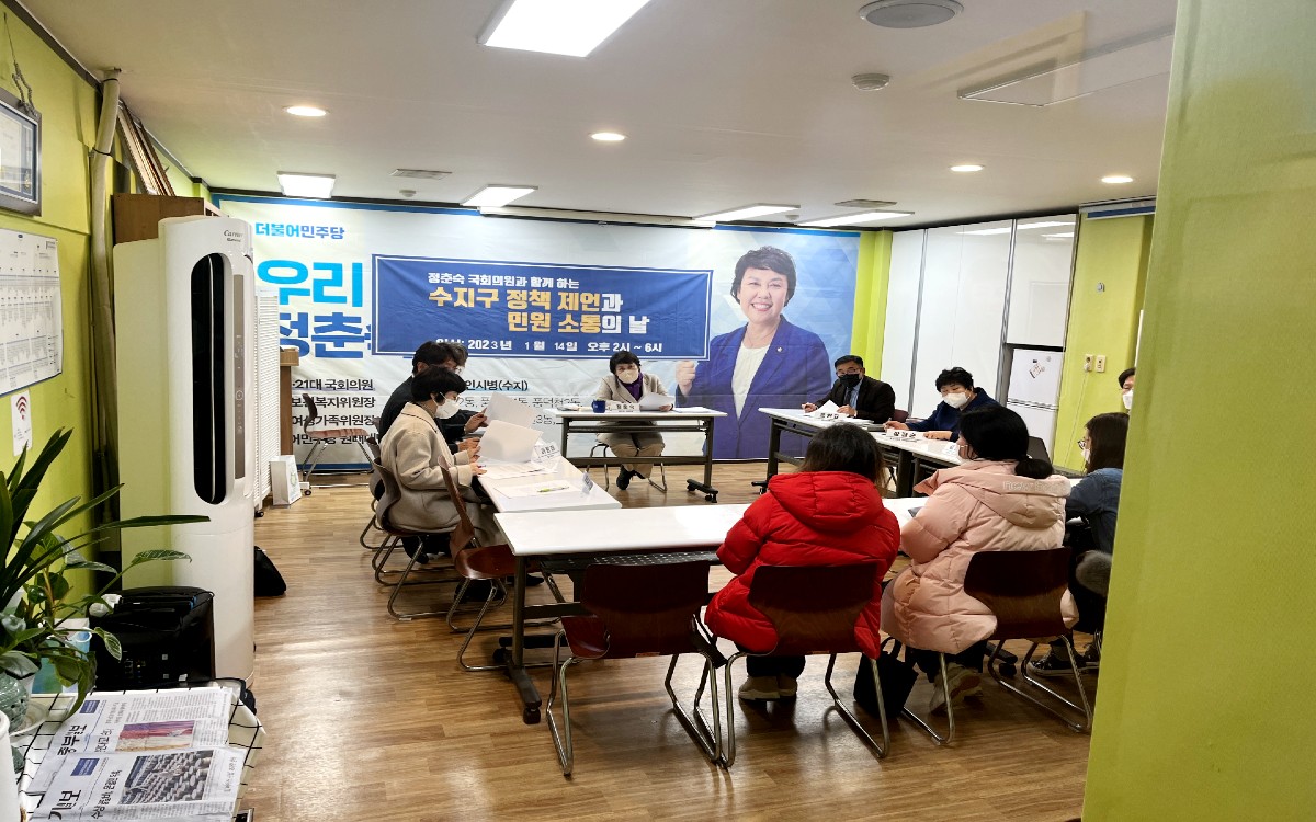 더불어민주당 정춘숙 의원(경기 용인시병·재선)은 1월 14일(토) 경기도 용인시 수지구 사무실에서 ‘수지구 정책제언과 민원소통의 날’을 개최했다.