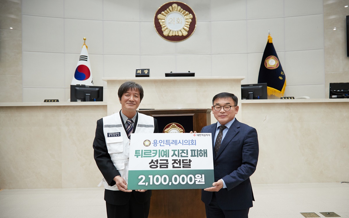 용인특례시의회(의장 윤원균)는 17일 10시 본회의장에서, 튀르키예 지진 복구를 위한 성금을 기탁했다.