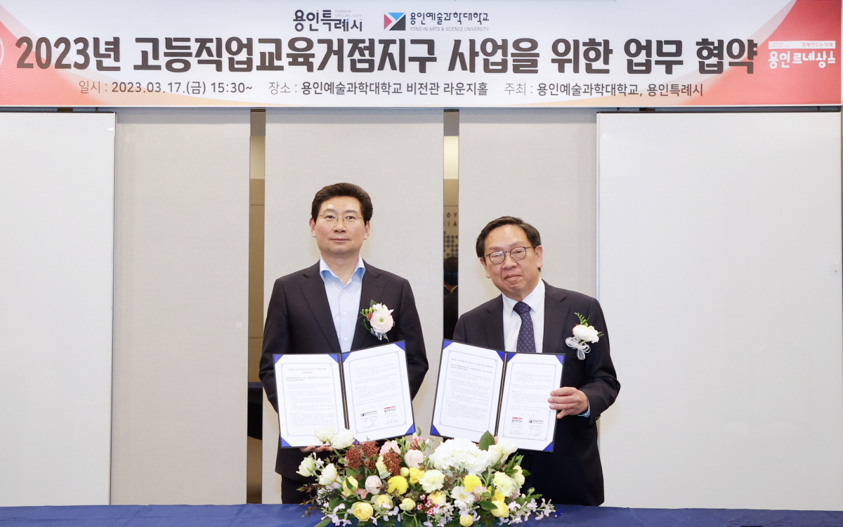용인특례시(시장 이상일)와 용인예술과학대가 교육부에서 추진하는, ‘고등직업 교육거점지구 사업’ 신청을 위한 업무협약을 17일 체결했다.