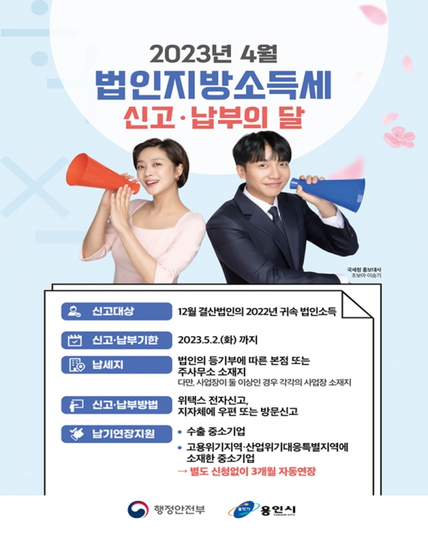 용인특례시(시장 이상일)가 4월 법인지방소득세 확정신고 납부의 달을 맞아, 신고를 독려하고 납부 방법을 안내했다.