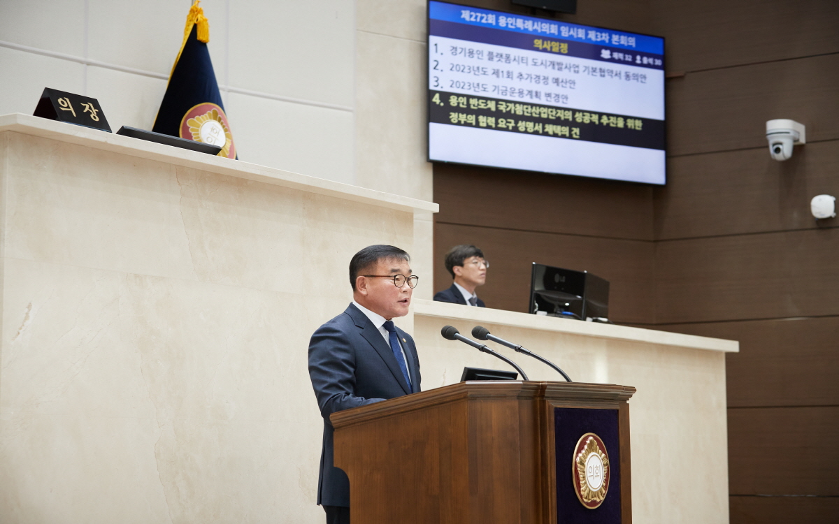용인특례시의회(의장 윤원균)는 19일 제272회 임시회 제3차 본회의에서 윤원균 의장이 대표발의하고 전원이 공동발의한 「용인 반도체 국가첨단산업단지의 성공적 추진을 위한 정부의 협력 요구 성명서」를 채택했다.