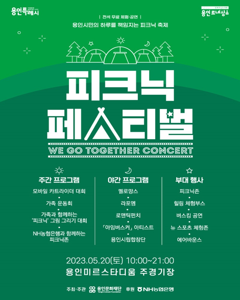 용인문화재단(이사장 이상일)은 ‘2023 피크닉 페스티벌 – We Go Together Concert’(이하 ‘피크닉 페스티벌’)를 오는 5월 20일 용인미르스타디움 주경기장에서 개최한다.