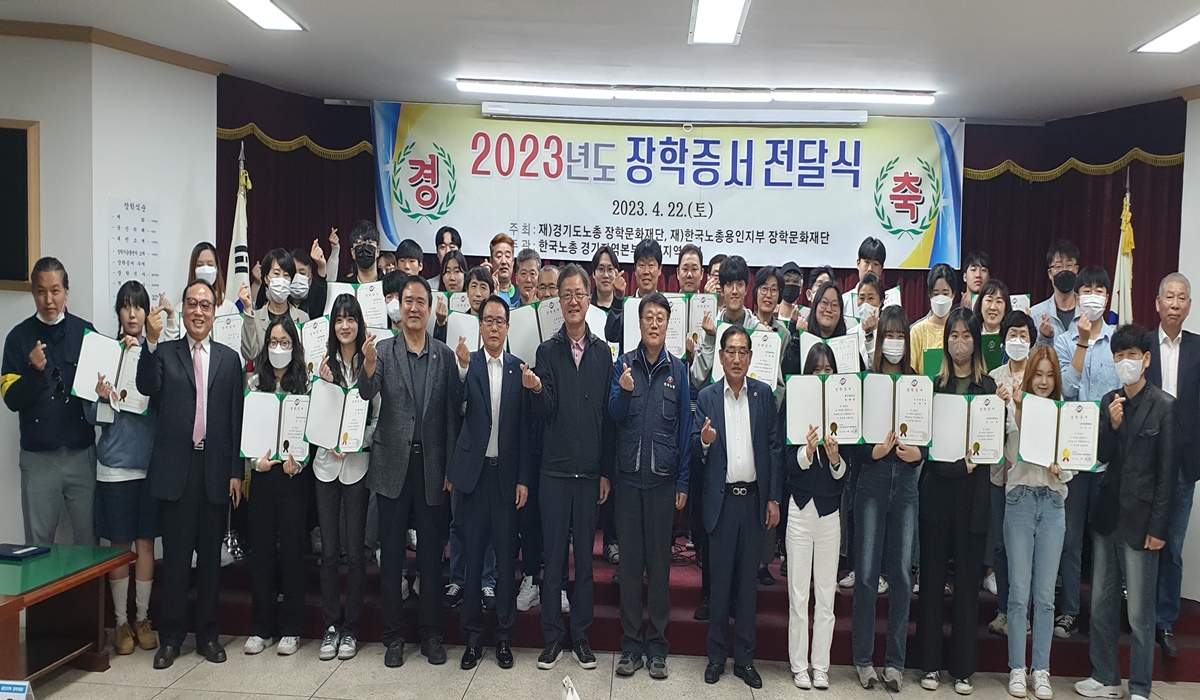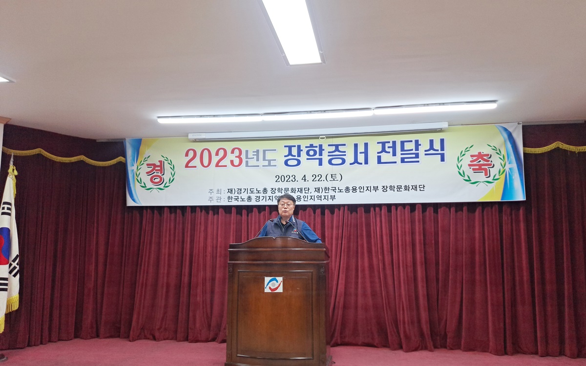 한국노총용인지역지부(의장 이상원)에서는, 4월 22일(토) 용인관내 노동자 자녀를 대상으로 장학생을 선발하여, 용인시노동복지회관 대회의실에서 2023년도 장학증서 전달식을 개최하였다.
