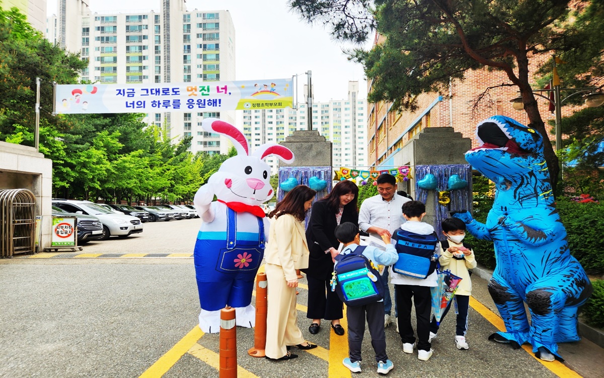 학부모회 임원 10여명은 직접 준비한 인형 옷을 입고, 정문과 후문에서 등교하는 아이들을 반갑게 맞이하였다.