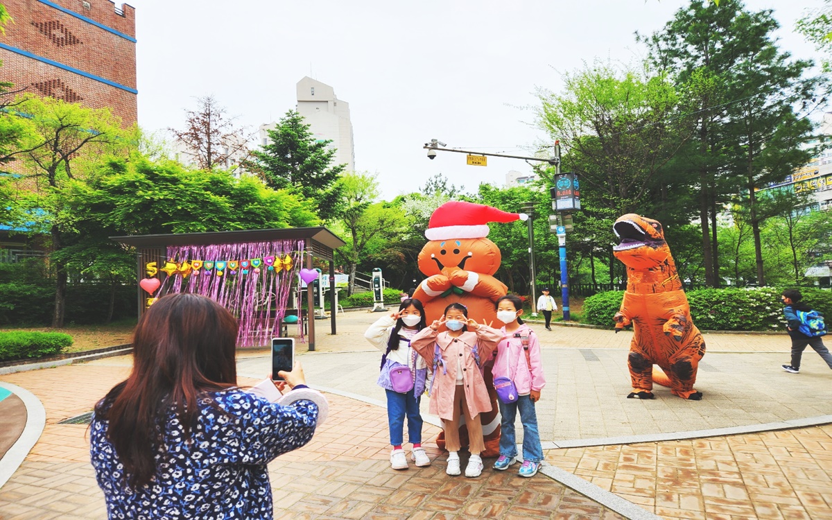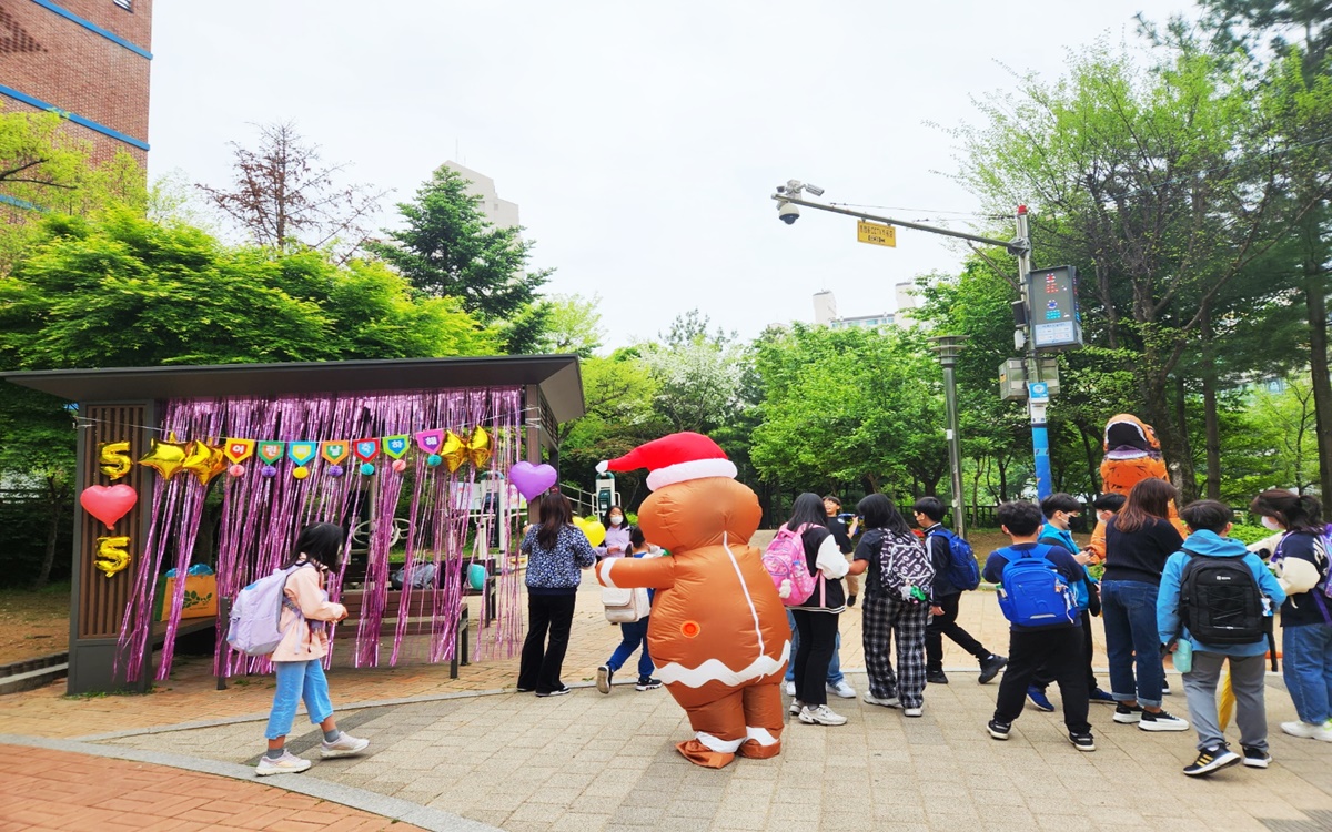 등교하는 아이들은 깜짝 놀라며‘이게 뭐지’의아해하면서도, 금새 즐거워하며 사진 촬영도 하고 행복한 모습이었다.