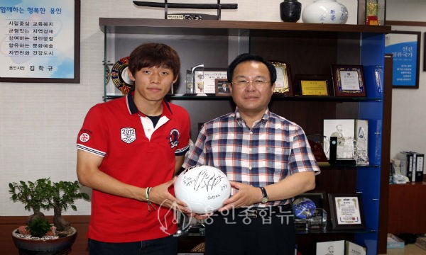 김학규 용인시장이 20일 오후 4시 30분 시장실에서 2012년 런던올림픽에서 축구 동메달 획득에 기여한 김보경 선수를 접견하고 격려했다.