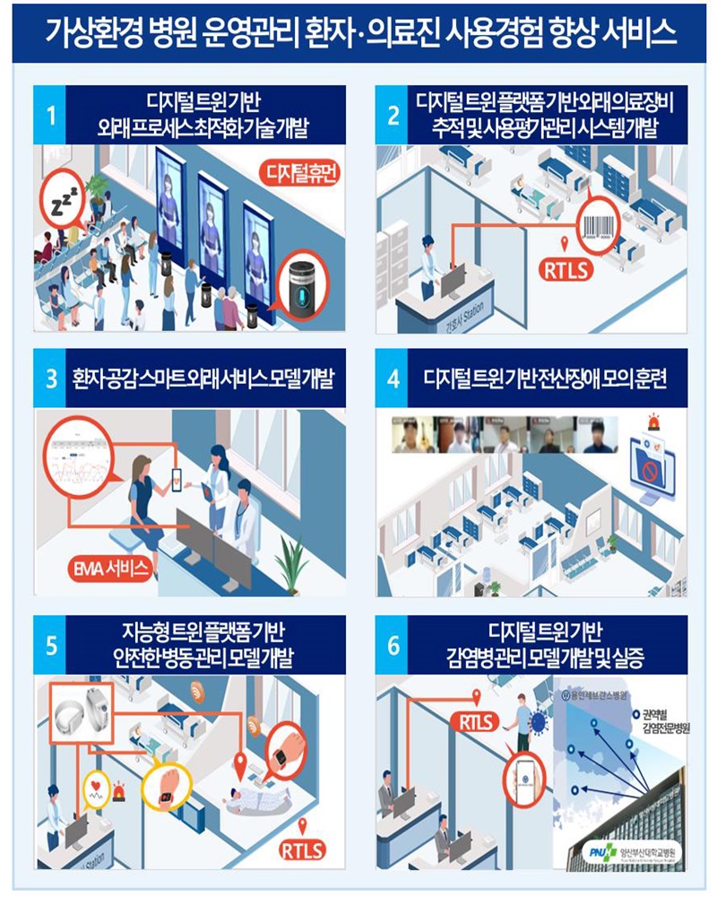 본 사업을 통해 ▲외래 프로세스 최적화 시스템 ▲외래 유형 자산 관리 시스템 ▲환자 공감 스마트 외래 서비스 ▲전산장애 대응 모의훈련 시뮬레이션 시스템 ▲안전한 병동 운영·관리 시스템 ▲감염병에 특화된 가상환경 기반 최첨단 병원 운영·관리 모델 등 다양한 연구·개발과 임상 현장 실증이 이루어진다. 특히, 실세계의 공간, 데이터, 이벤트를 모두 반영한 디지털 트윈 기술을 활용해 물리적으로 해결이 어려웠던 병원 업무 프로세스 최적화를 위한 다양한 연구를 진행할 계획이다.