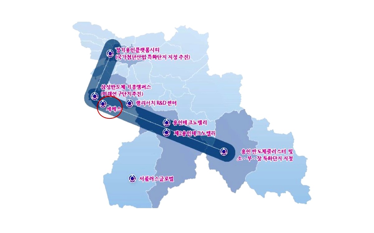 용인 L자형 반도체 벨트는 경기용인 플랫폼시티 첨단산업단지, 삼성미래 연구단지로 거듭날 삼성전자 기흥캠퍼스, ㈜세메스가 입주할 기흥미래 도시첨단산업단지, 지곡동의 램리서치 본사와 R&D센터, 용인테크노밸리와 제2용인테크노밸리, 처인구 원삼면의 용인 반도체클러스터와 남사·이동의, 시스템 반도체 국가산단을 유기적으로 연결해 시너지를 내도록 하자는 것입니다.