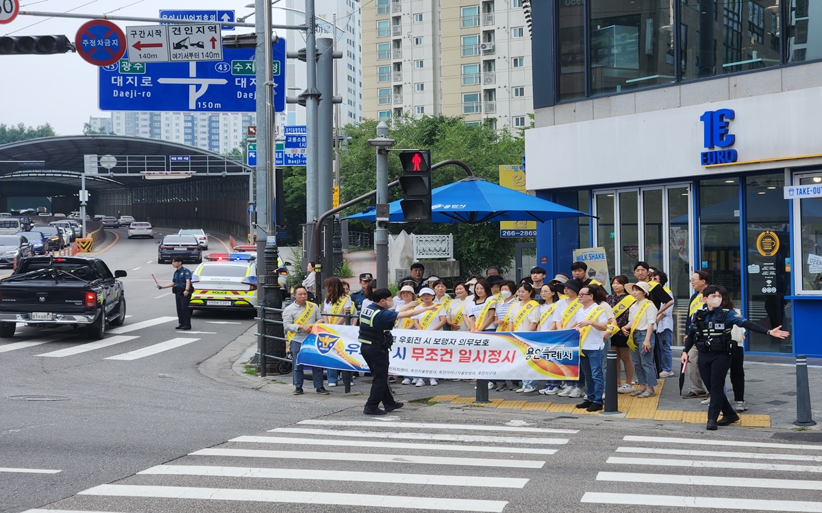 용인특례시 수지구 죽전1동은 안전한 교통환경을 조성하기 위해, 죽전교차로에서 자율방범대와 합동으로 ‘우회전 일시정지’ 캠페인을 펼쳤다고 5일 밝혔다.