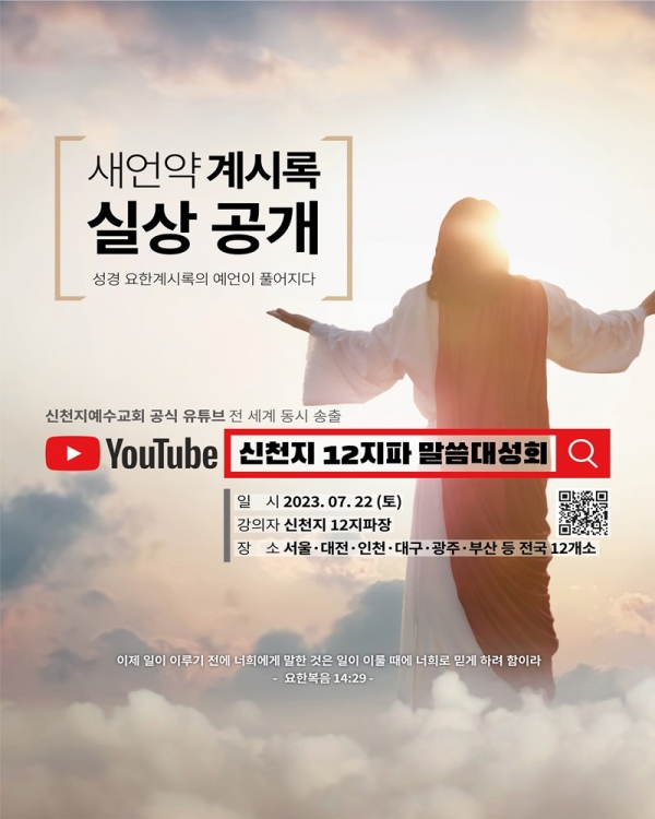 이에 신천지예수교회는 전국적인 요청과 문의를 받아들여 오는 22일 ▲서울특별시 영등포구 ▲서울 종로구 ▲경기도 수원시 ▲경기도 고양시 ▲인천광역시 연수구 ▲대전광역시 서구 ▲광주광역시 북구 ▲부산광역시 사하구 ▲부산광역시 동구 ▲대구광역시 달서구 ▲강원도 춘천시 ▲전라북도 전주시 등 전국 12지역에서 말씀대성회를 연다. 강연 주제는 ‘새 언약 계시록 실상 공개’이며, 신천지예수교회 12지파의 지파장이 강연자로 나선다.