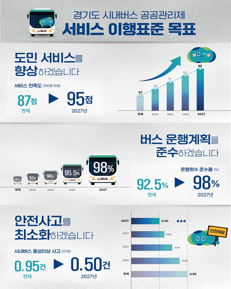 공공관리제 시행에 맞춰 안전하고 편리한 버스 서비스 제공을 위해 서비스 이행표준 목표를 수립했다. 구체적으로 ▲서비스 만족도는 현재 87점에서 2027년 95점 이상 개선 ▲버스 운행 횟수 준수율은 현재 92.5%에서 2027년 98% 이상 향상 ▲시내버스 중상 이상 사고 건수를 현재 1일당 0.95건에서 2027년 0.50건 이하로 목표를 설정했다.