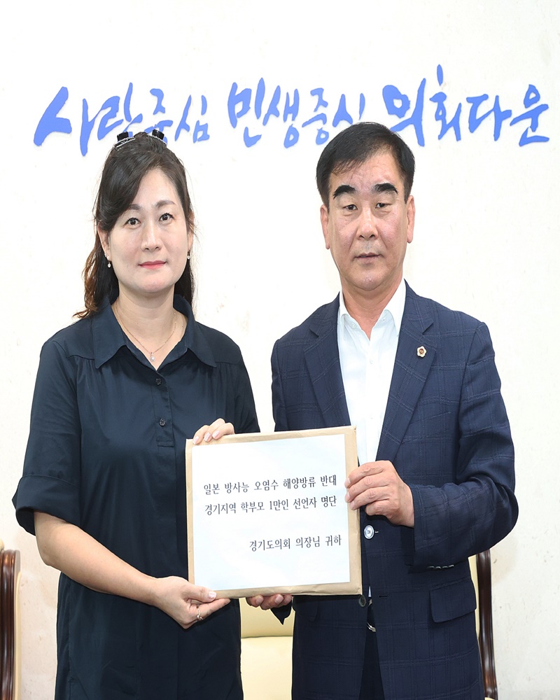이미경 시흥시 학교급식지원센터장 등 경기지역 학부모 20여 명은, 이날 오전 의장 접견실에서 오염수 방류 반대입장을 밝힌, 서명자 1만366명의 명단을 염 의장에게 공식 전달했다.