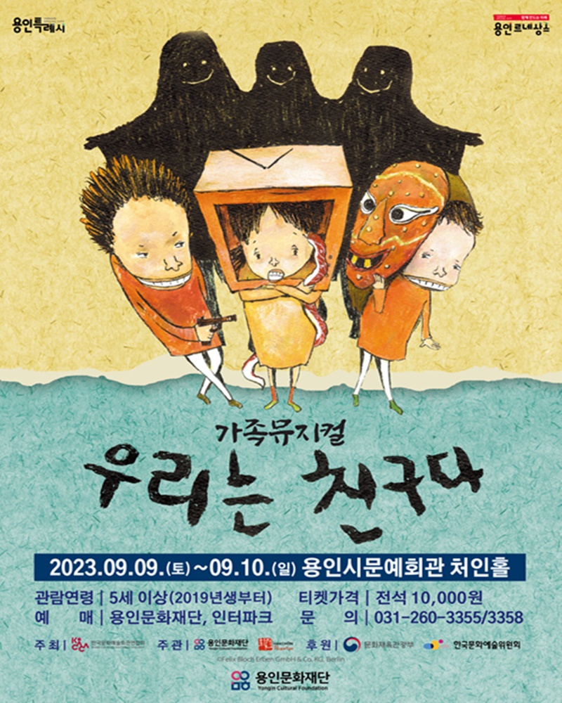 가족뮤지컬 <우리는 친구다>는 5세 이상(2019년생부터) 관람가로 전석 1만 원이며, 오는 7월 26일부터 용인문화재단 홈페이지 및 인터파크 티켓에서 예매할 수 있다. 자세한 사항은 용인문화재단 홈페이지 또는 CS센터(031-260-3355/3358)로 문의하면 된다.