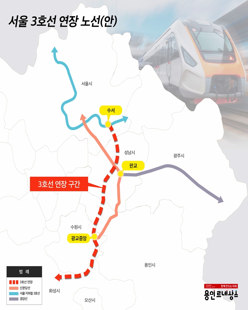 이와 관련, 시는 지난 5월 이상일 용인특례시장의 주선으로 이재준 수원특례시장, 신상진 성남시장, 정명근 화성시장이 오세훈 서울특별시장을 만나, 서울지하철 3호선의 경기 남부 연장에 대한 필요성을 강조하며 협조를 요청한 바 있다.