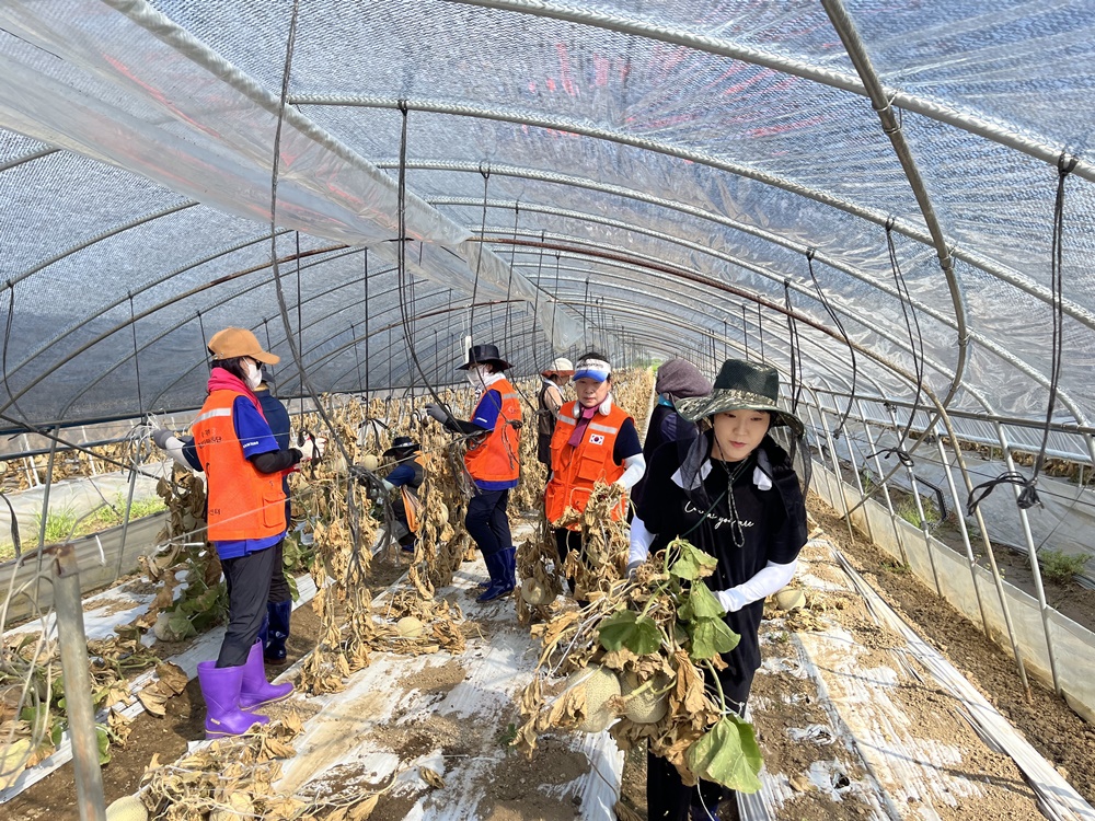 이번 봉사활동은 폭우로 인해 특별재난지역으로 지정된, 논산시의 수해 피해 농가의 일손을 돕고, 빠른 일상으로의 회복을 위해 진행되었으며, 메론 농가의 비닐하우스 토사물 제거와 시설물 정비 등 구슬땀을 흘렸다.