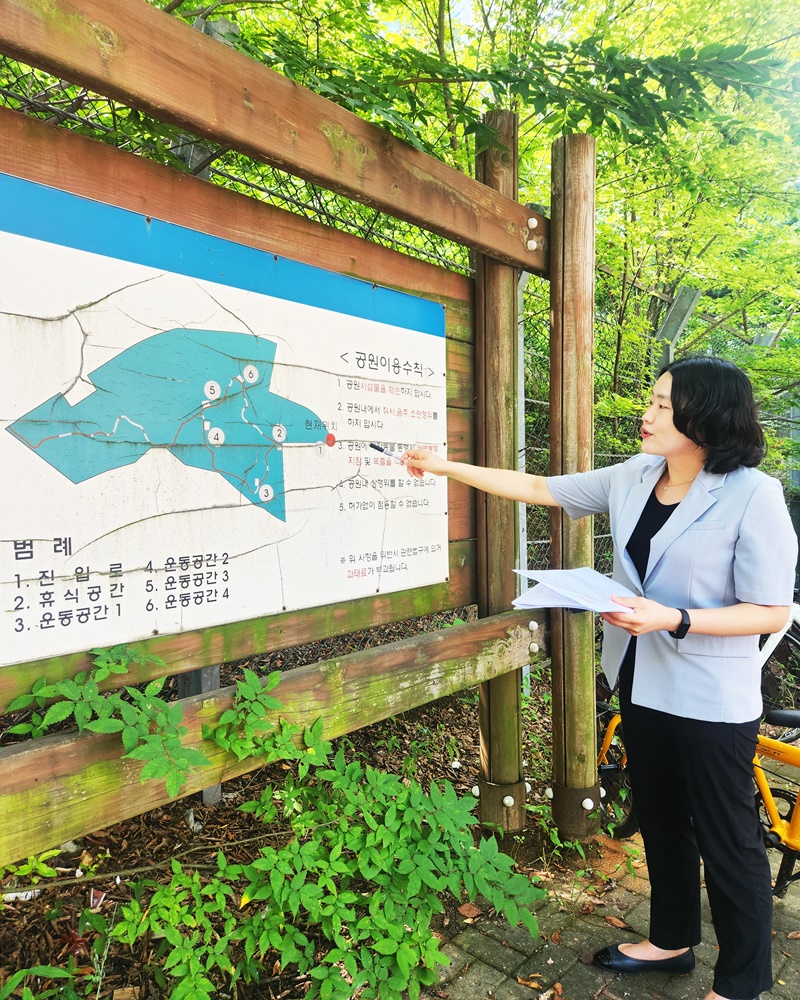 이날 신나연 의원은 강남근린공원 일대를 도보로 걸으며, 주민 불편사항이 있는지 직접 청취하고, 지난 7월까지 정비공사를 마무리한 숲길도 꼼꼼히 살펴봤다.