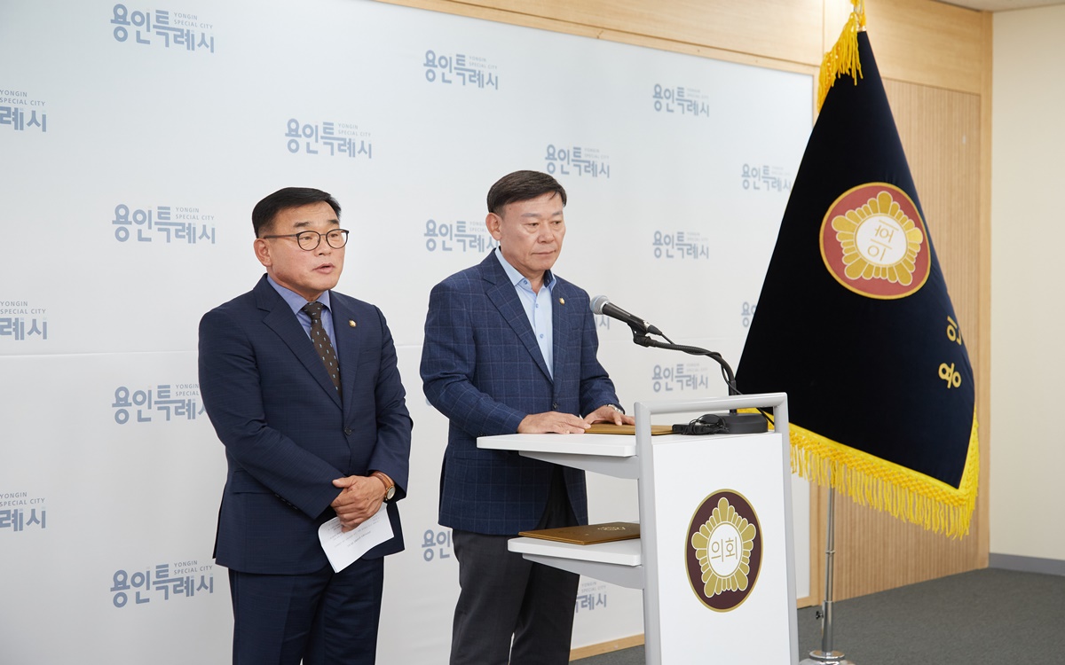용인특례시의회 윤원균 의장과 황재욱 의원은 7일 오후 2시, 시청 브리핑룸에서 사과 성명서를 발표했다.