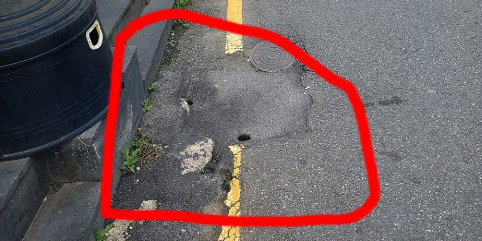 용인시 처인구 김량장동에 위치한 중앙시장 제1주차장 인근, 인도겸 차도로 되어있는 이면도로에, 큰 구멍이 나서 위함한데 그대로 방치하고있는 처인구청 도로관리 담당자들은, 이렇게 위험하게 구멍이 났는데도 무관심으로 일관하고 있다.