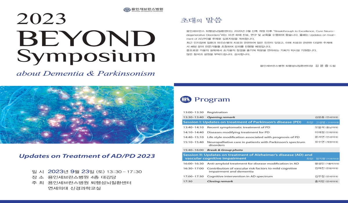 용인세브란스병원 퇴행성뇌질환센터는 ‘Breakthrough to Excellence, Cure Neurodegenerative Disorders’라는 미션 아래 진료, 연구 및 교육을 수행해왔다. 작년부터는 BEYOND 심포지엄(Breakthrough to Excellence Yongin Severance Hospital in Yonsei University Cure Neurodegenerative Disorders Symposium)을 개최해 퇴행성 신경질환에 대한 최신 지견을 나누고 있다.