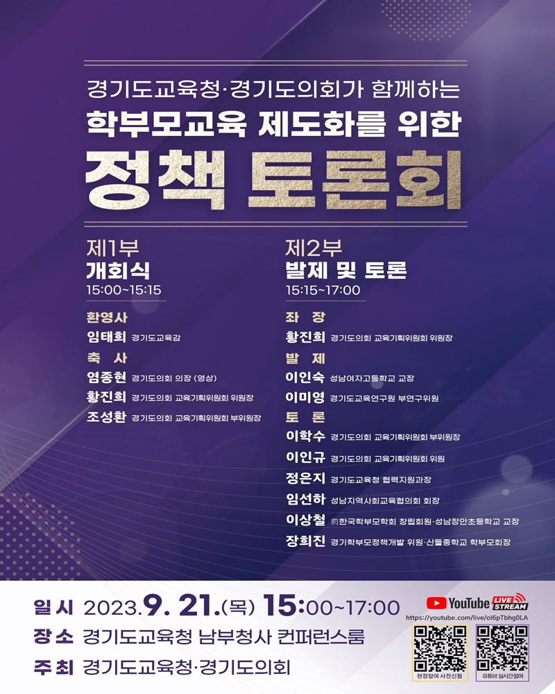 이어 황진희 도의회 교육기획위원회 위원장이 좌장을 맡아 ▲이학수 부위원장 ▲이인규 위원 ▲정은지 도교육청 협력지원과장 ▲임선하 성남지역사회교육협의회 회장 ▲이상철 성남장안초 교장 ▲장희진 산들중 학부모회장이 참여해 학부모교육 제도화 방안에 대해 의견을 교환한다.