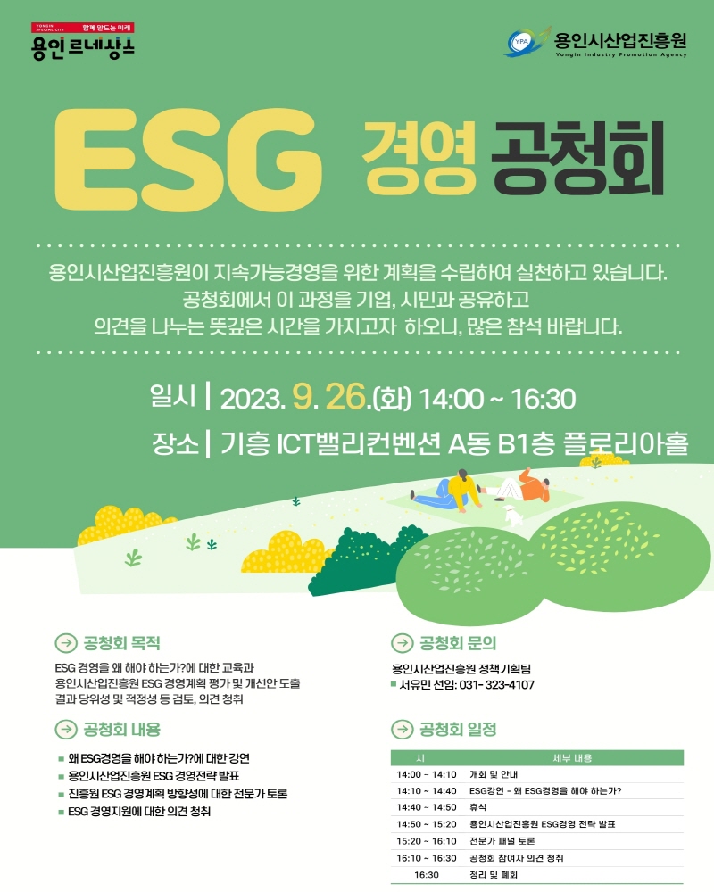 용인시산업진흥원(이사장 이상일, 이하 진흥원)에서, ESG 경영계획 평가 및 개선안 도출에 대한 전문가와 수혜기업, 용인시민 등의 의견을 수렴하기 위해 오는 26일 공청회를 개최한다고 밝혔다.