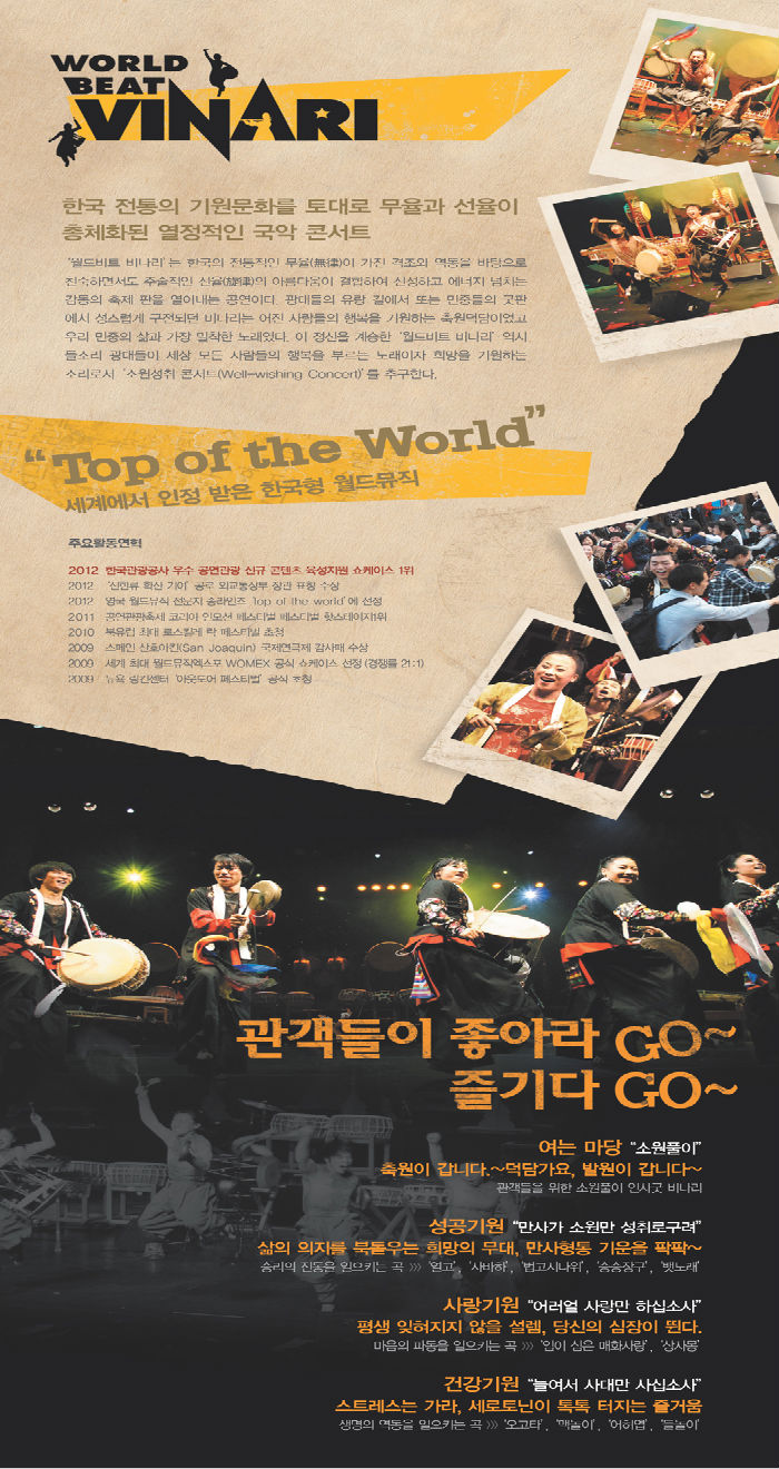 ‘월드비트 비나리’ 콘서트는 한국의 전통 타악과 기악, 성악(판소리, 민요) 등을 전 세계인이 함께 즐길 수 있는 소리로 재구성하여 빠르고 역동적인 우리 장단을 가미해 밝고 흥겨운 퍼포먼스로 구성한 국악 퍼포먼스 콘서트이다. 세상 모든 사람들의 행복을 부르는 노래이자 희망을 기원하는 ‘소원성취 콘서트’를 추구한다.