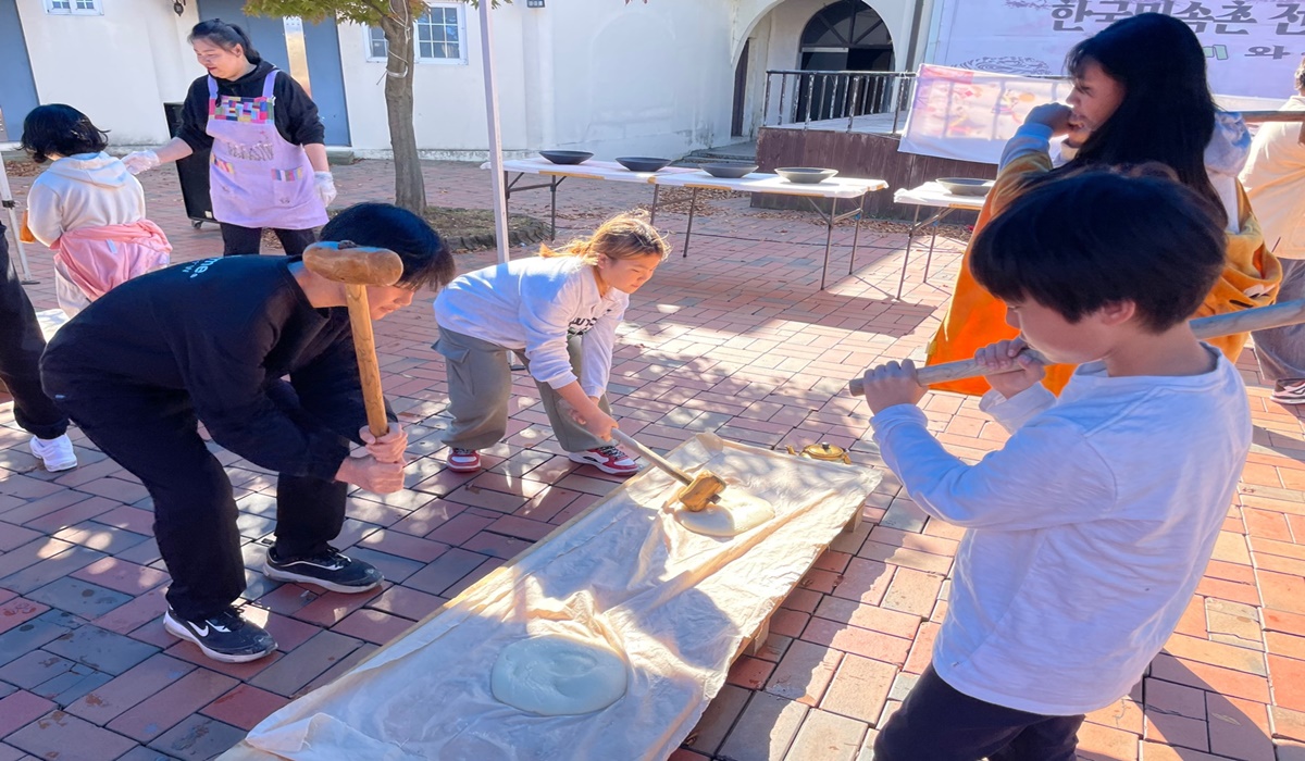 ‘쿵~떡! 쿵~떡!’ 지난 21일 용인시청소년미래재단 용인시청소년수련관 청소년방과후아카데미(이사장 이상일) 청소년들의 떡메치는 소리가 한국민속촌에 울려 퍼졌다.