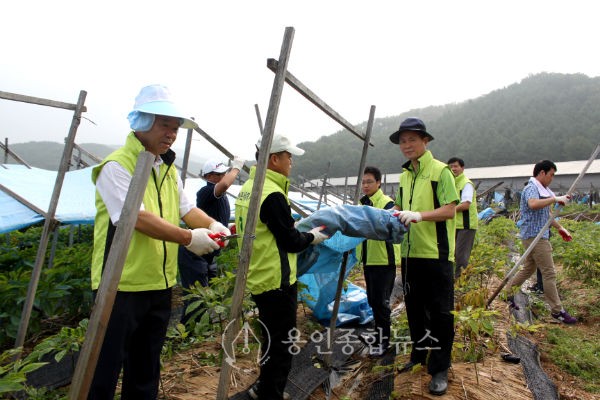 NH농협 용인시지부(지부장 서은호)용인축산농협(조합장 어윤황)이동농협(조합장 어운우)직원 40여명은 9월 3일 제14호 태풍 덴빈, 제15호 태풍 볼라벤으로 인한 집중 호우 및 강풍으로 파손된 이동면 묘봉리 인삼재배사에서 13,000㎡ 에 설치되었던 지주목과 차광막 시설 등을 해체하는 작업을 실시하였다.