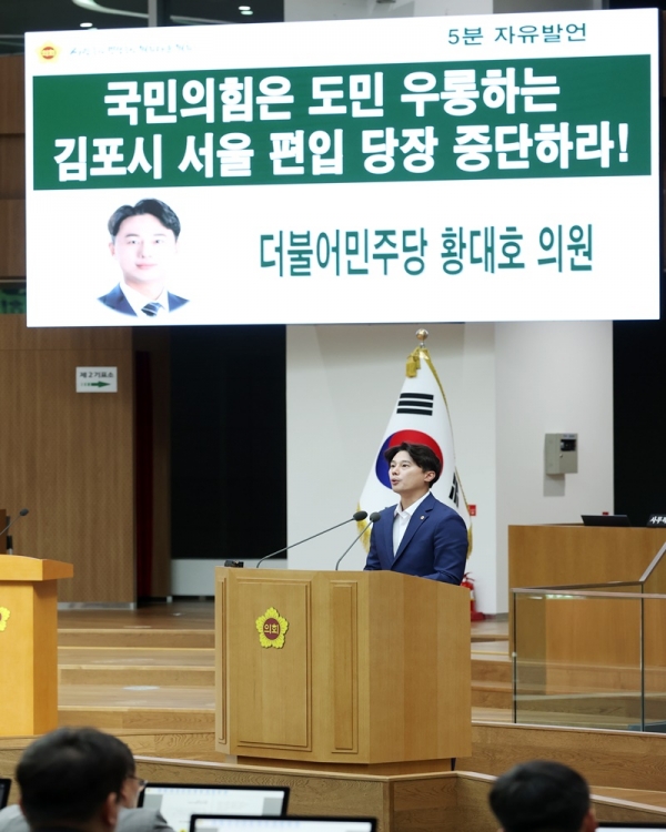 경기도의회 더불어민주당 황대호 수석대변인(수원3)은 7일(화) 열린 제372회 정례회 1차 본회의 5분 발언을 통해, 국민의힘에게 최근 논란이 되고 있는 김포시 서울 편입 추진 중단을 강력 촉구했다.