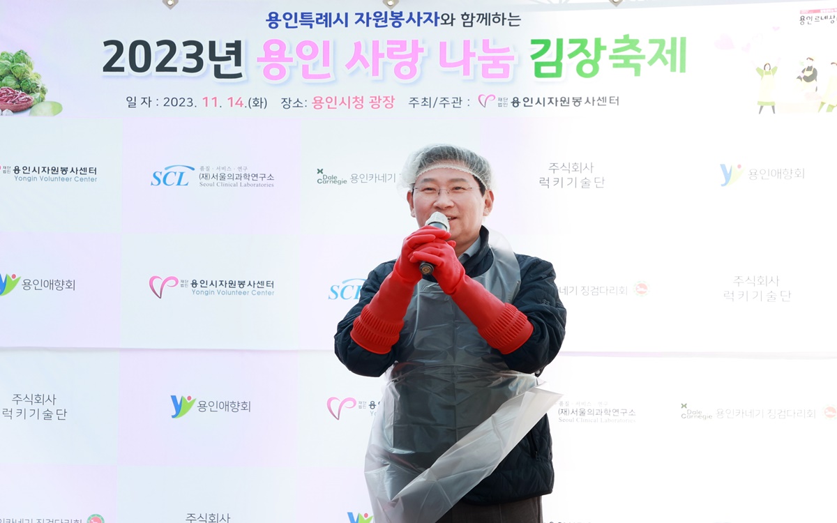 용인시자원봉사센터 이사장인 이상일 용인특례시장은, 이날 행사에 참여한 봉사자들을 격려하고 함께 김치를 담갔다.