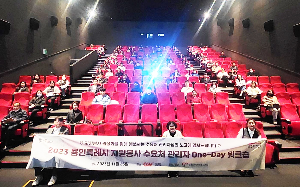 동백 CGV에서 진행된 워크숍에는 용인 관내에서 근무 중인 자원봉사 수요처 관리자 약 100여명이 참석했으며, 워크숍은 1부 ‘특별강의’와 2부 ‘영화관람’으로 진행됐다.