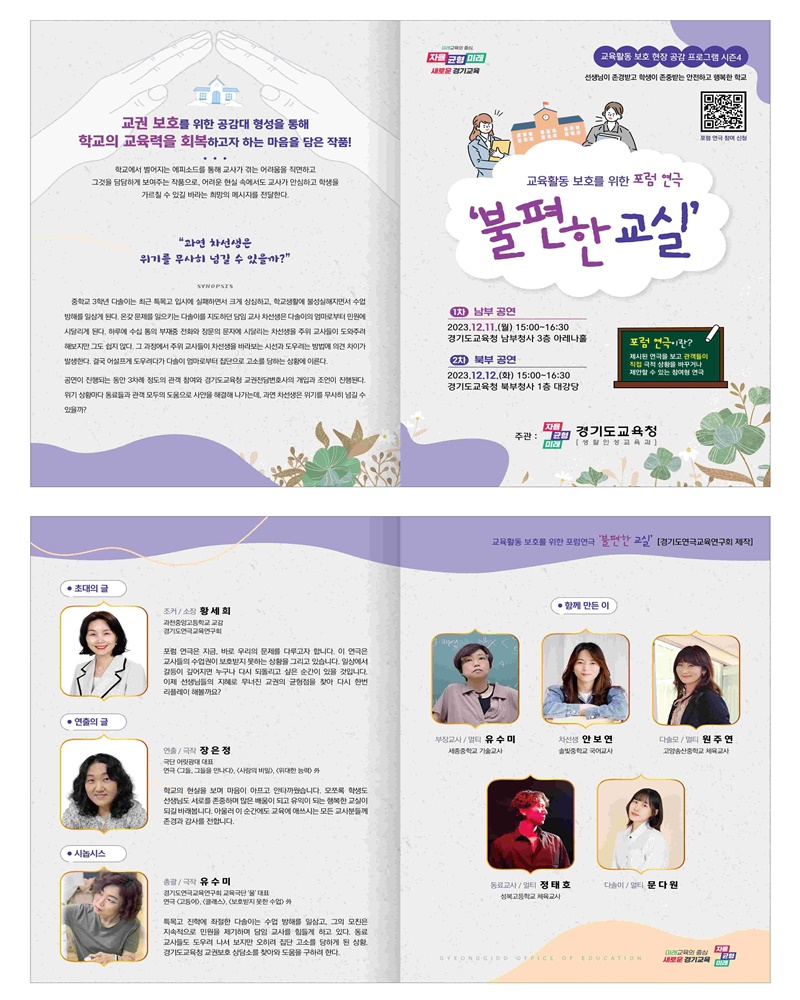 연극 제목은 ‘불편한 교실’로 경기도연극교육연구회 교사들이 중심이 돼 교육활동 침해 상황 속에서도 안심하고 학생을 가르칠 수 있기를 바라는 희망의 메시지를 전달한다.