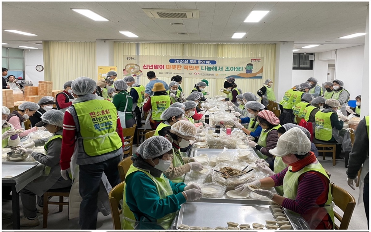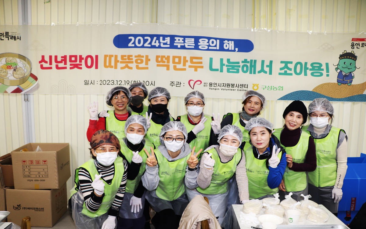 (재)용인시자원봉사센터(이사장 이상일)는 지난 19일, 구성농협 본점에서 용인시자원봉사대학 수료생 65명, 구성농협 임직원 15명과 함께 용인 관내 취약계층 400가정, 1,600인분의 만두를 빚어 전달하는 신년맞이 떡만두 나눔 행사를 진행하였다