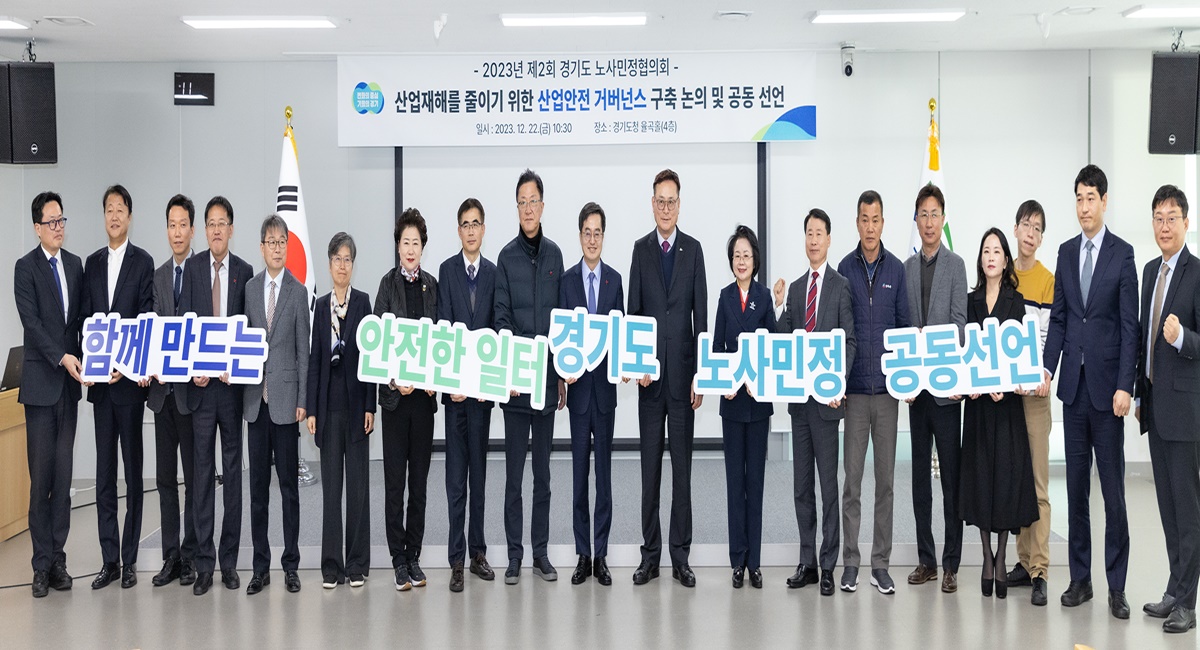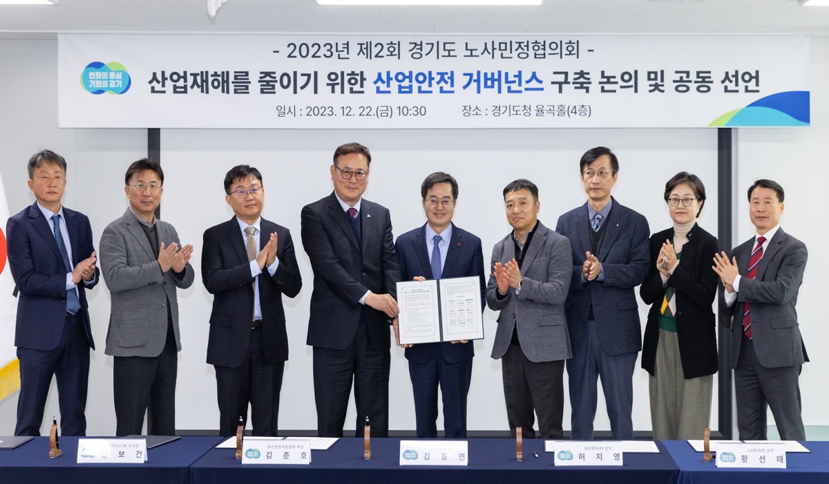 김동연 경기도지사는 22일 경기도청 율곡홀에서 김연풍 한국노총 경기지역본부 의장, 김춘호 경기경영자총협회 회장, 노길준 경기지방노동위원회 위원장과 노사민정협의회 위원 등 50여 명이 함께한 가운데, 2023년 제2회 경기도 노사민정협의회를 열고, 이런 내용을 담은 공동선언을 했다.