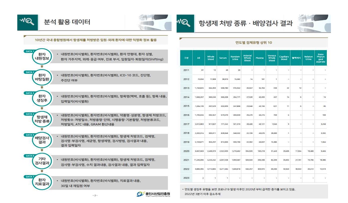 감염병 빅데이터 거래소에 게시된 의료데이터는 10년간 국내 종합병원에서 항생제를 처방받은 입원・외래 환자에 대한 익명화 처리된 정보로 개인정보(내원번호, 환자번호 등)를 비식별화 처리하였다.