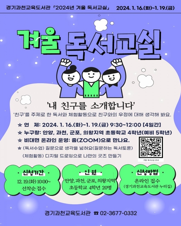 경기과천교육도서관(관장 조정수)이 겨울방학을 맞아, 오는 16일부터 19일까지 과천·안양·군포·의왕 지역 초등학교 4학년을 대상으로 온라인 ‘겨울 독서교실’을 운영한다.