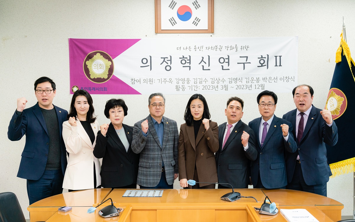 용인특례시의회 의원연구단체 「의정혁신연구회Ⅱ」는 지방의회 권한 확보와 자치분권 강화 방안을 연구해 용인특례시의회의 위상을 높이고자 결성됐다. 기주옥(대표), 김길수(간사), 강영웅, 김상수, 김영식, 김운봉, 박은선, 이창식 의원 등 8명이 활발한 활동을 하고 있는 「의정혁신연구회Ⅱ」의 지난 1년을 돌아봤다.