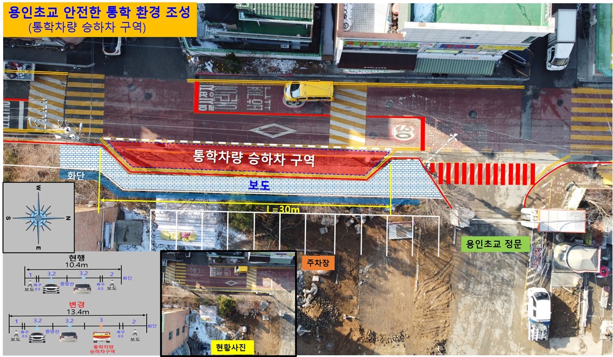 처인구는 학생들이 안전하게 하차할 수 있는 공간을 만들기 위해, 용인초등학교 정문 앞에 30m 길이의 승하차 구역 설치를 결정했다.