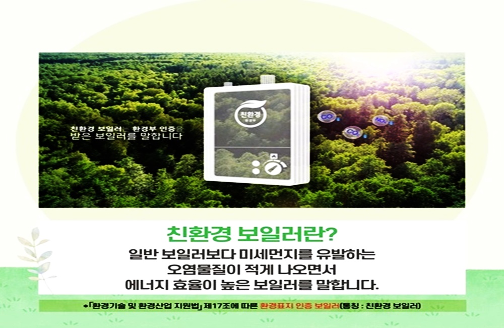 친환경 보일러는 질소산화물 배출량이 일반 보일러의 8분의 1 수준으로 에너지 효율도 일반 노후 보일러와 비교해, 약 12% 높아 1대당 연간 최대 44만원의 연료비가 절감되는 것으로 알려졌다.