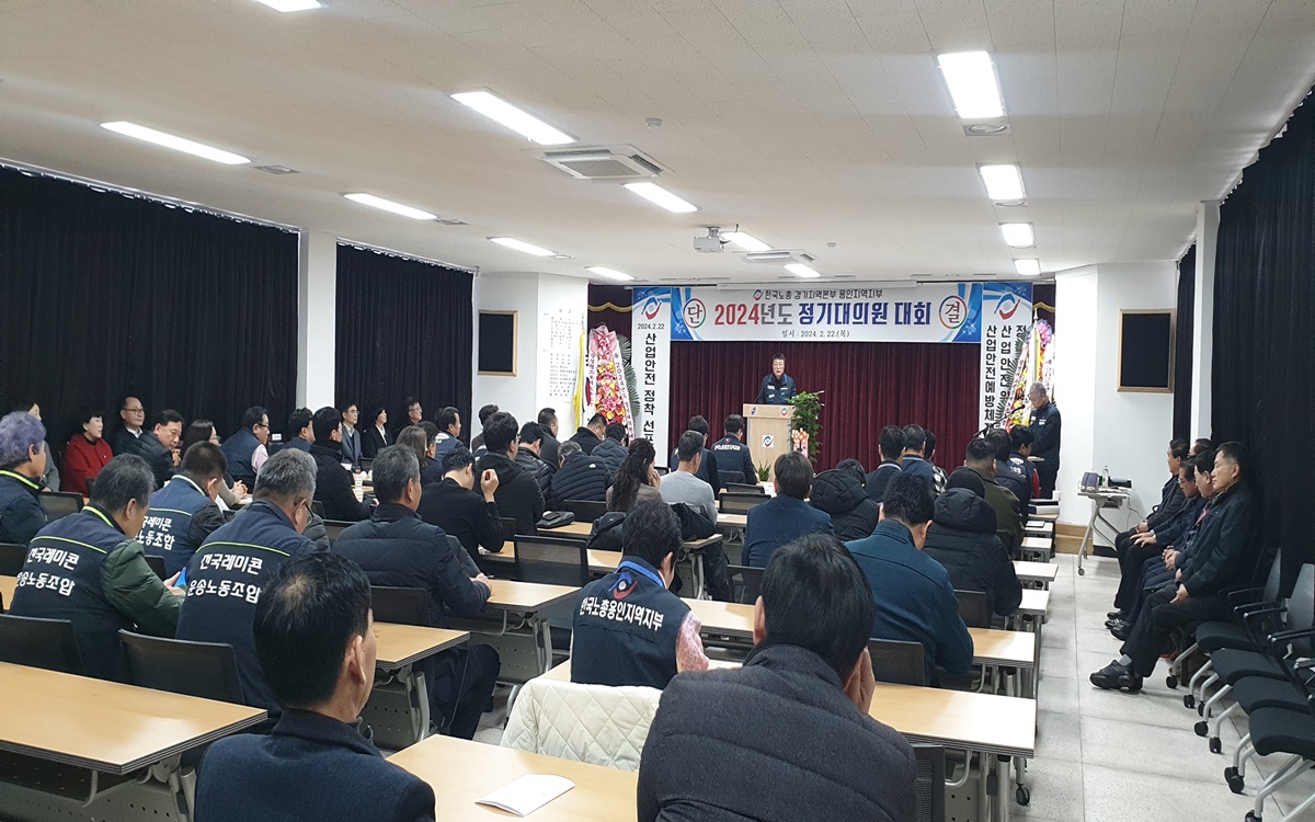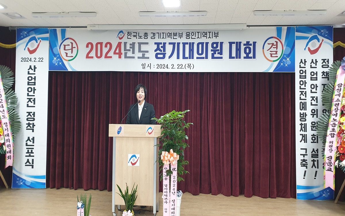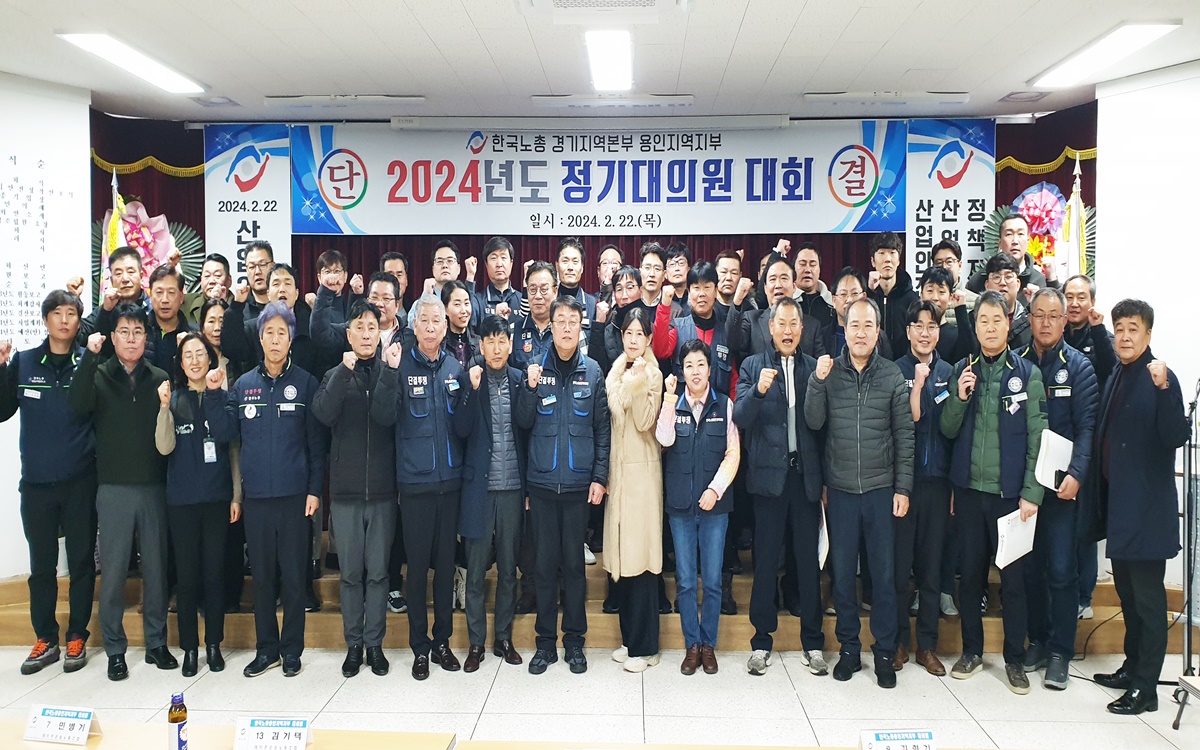 한국노총 용인지역지부(의장 이상원)는 2월 22일, 용인노동복지회관 1층 대회의실에서, 한국노총경기본부 김연풍의장, 용인시청 일자리산업국 이기옥국장, 노동부 경기지청 강운경지청장 및 국회의원, 도,시의원등 노사정관계자 및 내.외빈을 모시고 「2024년 정기대의원대회」를 개최하였다.